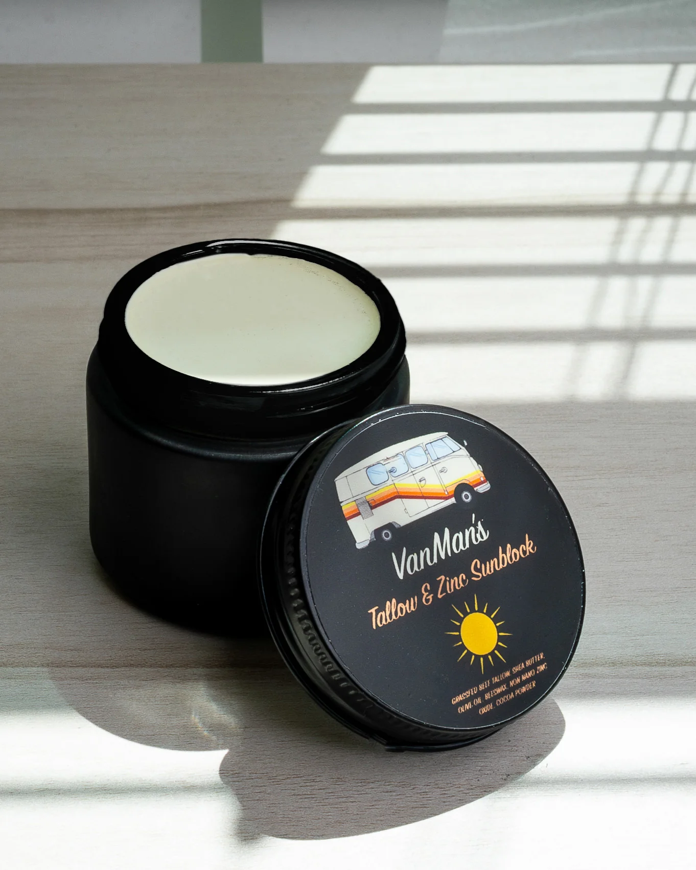 VanMan’s Tallow & Zinc Sunblock like all VanMan products uses 100% edible ingredients. Instead of chemically changing your skin to not burn, VanMan’s sunblock uses non-nano Zinc Oxide to act as a mineral barrier.